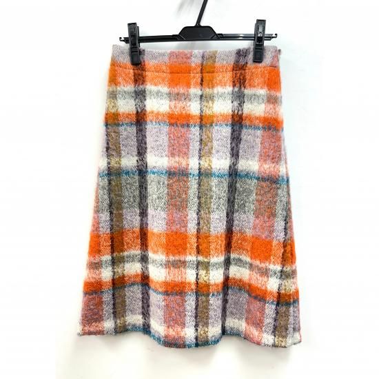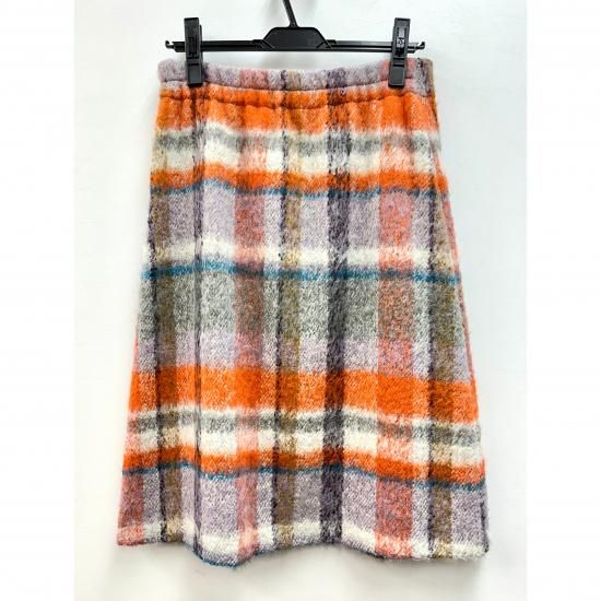 イタリア製のイソラというアルパカ混の素材のシャギーチェックの台形スカート。アルパカ混のシャギー素材のスカートは、複雑な色の組み合わせでチェックを表現していて、上品な印象をあたえてくれる。