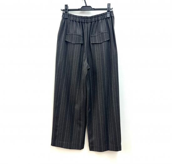 シックなマルチストライプのやや膨らみのある生地を使用したプルオンパンツが登場しました。タックが施された前身頃とゴム仕様の後ろウエスト部分が、優しい履き心地とフィット感を叶えます。